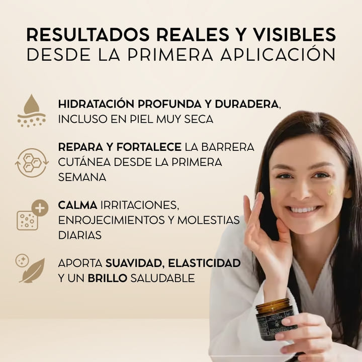 💧 Su textura cremosa se funde al contacto con la piel, proporcionando una hidratación profunda y duradera sin dejar residuos grasos. Cada aplicación nutre, repara y protege, gracias a su rica composición en vitaminas A, D, E y K y ácidos grasos esenciales, claves para fortalecer la barrera cutánea y regenerar los tejidos desde el interior.